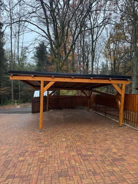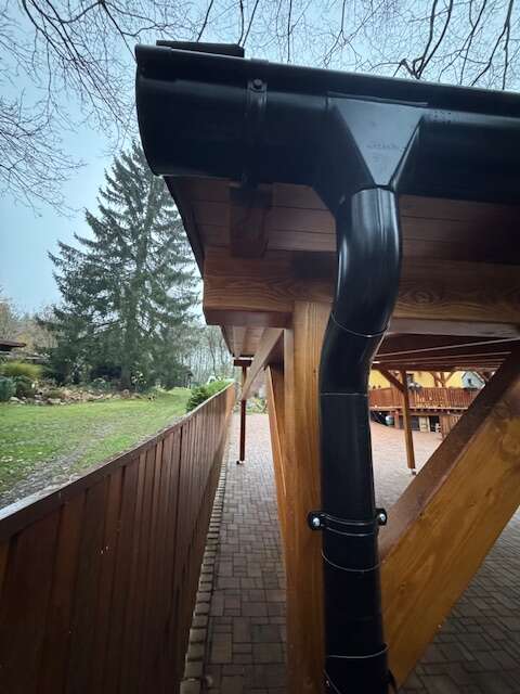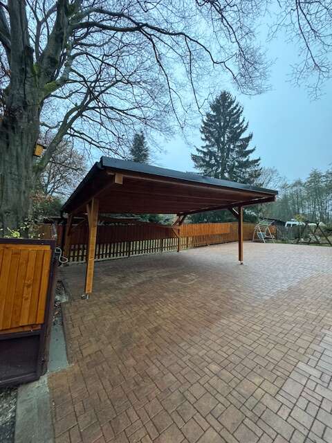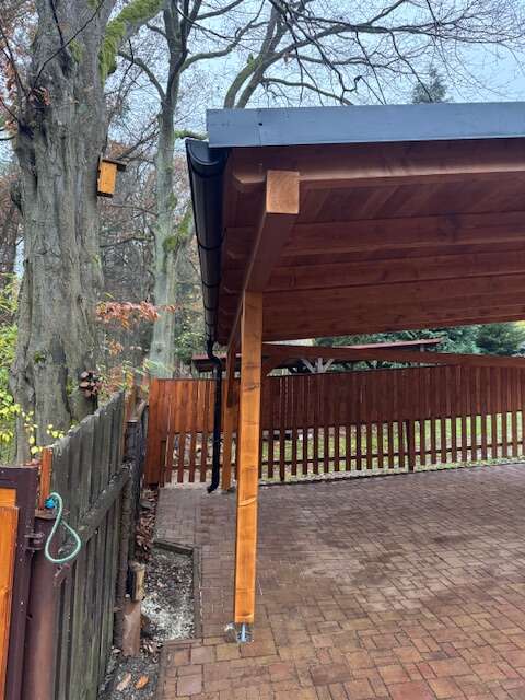 Běhěm začátku listopadu jsme na objednávku zákazníka realizovali garážové stání v obci Kytín. Garážové stání bylo zhotoveno ze smrkového masivu KVH hranolů o rozměrech 160×120 mm a velikost celé stavby byla v rozměru 555×625 cm. Garážové stání je doplněno palubkovým záklopem. Na zastřešení jsme použili trapézové plechy v černé barvě, ke kterým jsme dali okapový systém. Nátěr byl proveden olejovou lazurou barvou zlatý dub. Specifikum této stavby bylo, že garážové stání bylo stavěno kompletně ve svahu.