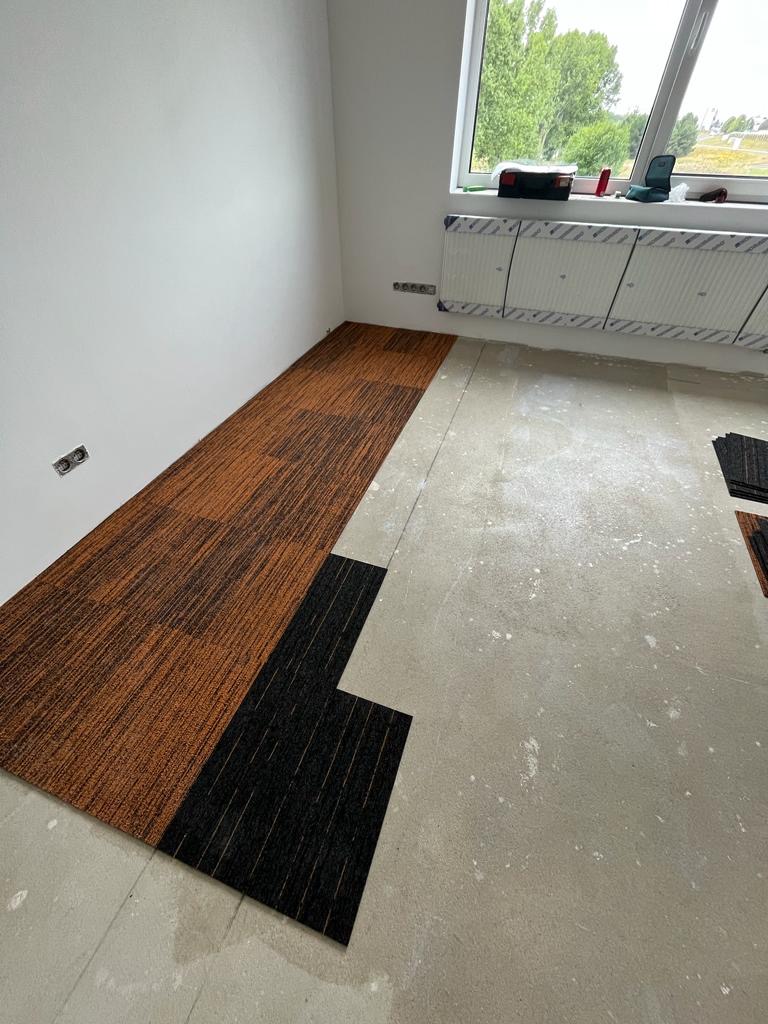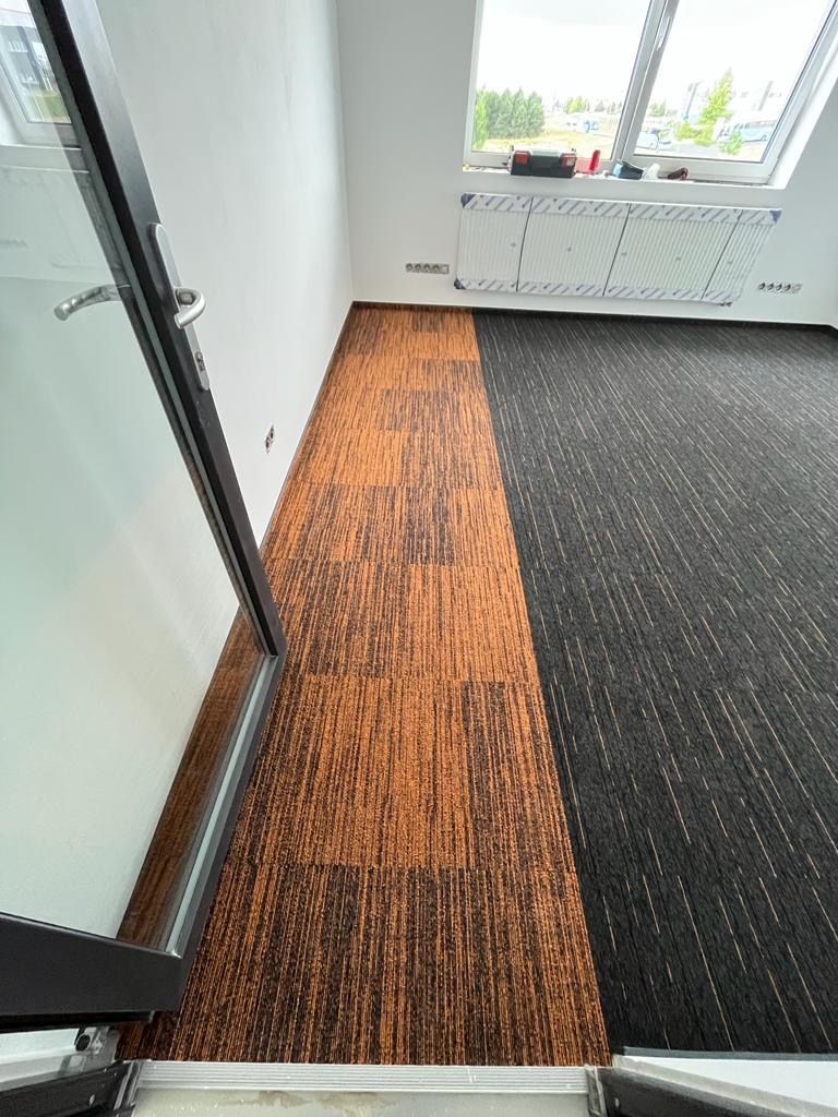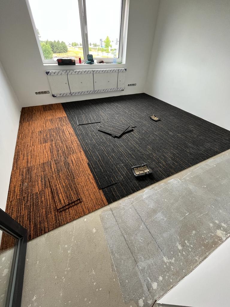 Dle zadání zákazníka jsme provedli pokládku v nové administrativní budově v Hostivicích u Prahy, Předmětem zakázky byla pokládka kobercových čtverců na fixační lepidlo, dále jsme obkládaly schody a provozní chodby vynilem.